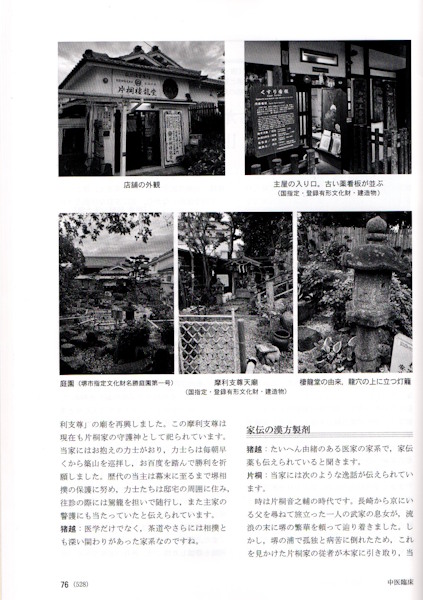 近年日本を代表する漢方の専門雑誌に当家のこと度々取り上げていただき有り難い事と思っています。 冠元顆粒の関連で専門学術医薬雑誌の「中医臨床」で特集していただきました。 本雑誌は中国医学関連の最高権威の医療関係者専門雑誌で漢方圏の中国,韓国,台湾,英国, フランスなど 専門家必携の 最新中医薬雑誌で齢をかさねて来宅起稿された編集部, 同伴のイスクラ陳社長, 中医薬研究会会長猪越様に感謝いたします ![]() ニッポンの漢方薬局を訪ねる 片桐棲龍堂 片桐 平智先生 日本の伝統薬の継承と中国の中成薬の活用 ![]() Profile 片桐平智 (かたぎりよしとも) 1947年生まれ。 大阪薬科大学卒。 大阪府衛生部 (現・健康医療部) を経て, 創業4百有余年以上の 片桐棲龍堂を大阪府堺市で経営。 日本の伝統薬の継承と黎明期の中成薬の開発導入に貢献する。 奈良東大寺修二会の薬物担当。 日本東洋医学会会員。 日本初の漢方資料館を開設運営し、 欧州や中国など海外の専門家との国際交流を続ける。 【聞き手/猪越英明】 創業400有余年の歴史を誇る老舗の漢方薬舗 「片桐棲龍堂」。 日本の伝統医学を基礎にしながら中医学による中成薬なども取り入れ、地域住民の健康を支えながら 伝統漢方の素晴らしさを継承してきた。 また併設する漢方資料館には医薬学に関する大量の資料が収蔵されており, 国内外の研究者から 高い評価を受けている。 今回は片桐棲龍堂17代当主・片桐平智先生に, 普段は一般公開されていない漢方資料館を 特別にご案内いただきながら、東西薬局代表の猪越英明先生が話を伺った。 (編集部) 堺と伝統医学 猪越: 本日はお忙しいなかありがとうございます。 こちらは創業文禄2年(1593年) ということで, 4百年を超える歴史を誇る薬局 (現在は薬舗) です。 まず, 薬局の歴史に関連して,ここ堺と医学との関わりからお聞かせいただけますか。 片桐: 堺は古くから諸外国との交易が盛んで薬種の入手も容易であったことから,日本における医学の 発展は堺や和泉地方を中心に始まったといっても過言ではありません。 応仁・文明の乱(1466〜1477年) によって京都が荒廃した際には,一時的に堺へ文化が移り, 最新の中国医学も堺を経て広まりました。 堺の名医としては, 半井 (和気わき) 家と竹田薬師院家が知られています。 半井(なからい)家の初代 半井明親(あきちか)は,明の時代、武宗皇帝 (正徳帝,在位1505〜1521年) が 重い病にかかった際, 三国の名医を探しても治せる者が見つからず、ついには日本から明親が渡海して これを治癒せしめたと伝えられています。 この功績により, 皇帝から驢馬を賜り, 「驢庵」 と号しました。 この逸話からも、当時すでに日本の漢方が中国の水準を凌駕していたといっても過言ではないでしょう。 私たちの祖先は,文禄の役 (1592〜1598年)の折, 豊臣秀吉より堺 湊の地を賜りました。 それ以前は播磨(はりま)の妻鹿(めが)や鞆津(とものつ)に居住しており,島津氏長の末裔である 目賀 (または妻鹿) 孫三郎の子孫にあたります。 この一族は, 薩摩妻鹿の出身で, 大徳寺の前身である大徳庵を寄進した赤松円心の家臣でした。 その縁から, 大徳寺の守護神である 「白澤 (はくたく)」 が当家の守護神となっています。 当時は軍医として, 戦傷の治療や城郭内の薬の管理などに従事していたと伝わります。 また,水軍を率いており, 朝鮮出兵の際には, 秀吉公より「櫓の音が見事に揃っている」と称賛され, 「音揃(おんぞろ)」 の姓を賜ったといわれています。 その折, 大坂川口の堺湊浦に土地を授けられました。 以後, 堺・湊に居を構えてからは, 「戦傷も腹部の傷も同じ」という考えのもと, 産婦人科を専門とし、 明治に至るまで諸藩の御典医なども務めました。 ![]() 片桐家の系譜 猪越: 薩摩の島津家と関係のある家系だったのですね。 片桐: 系図によれば, 当家の祖先は鎌倉時代(12世紀末〜1333年) にその端を発し, 清和源氏の流れを汲む薩摩の島津氏長の末裔で、目賀氏を称していました。 古い定紋は島津家と同様に 「丸に十の字」 と 「笹龍胆(ささりんどう)」 の紋様です (現在の家紋は音揃家の軍扇にちなみ高崎扇)。 建武の中興 (1334〜1336年)の際, 播州・苔縄(こけなわ)城主の赤松円心が功を立てた折, これに従軍した目賀孫三郎が, 当家における医学の祖と伝えられています。 孫三郎は優れた兵術家 剣術家で,また四書五経にも通じており, 軍陣医学, すなわち金創医学の実践にも卓越していたと伝承されています。 以来, 当家には軍師としての系統が受け継がれ, 医学の知識も口訣(<けつ)として 代々伝えられてきました。 また自家の存続のために蓄えられた医学の知識には, 南蛮系の薬物も含まれていました。 大名との親交も深く, 当時を伝える遺品として,桂皮油や椰子油を入れたルソンの薬壺や, オランダ製のギャマン薬徳利などが今も伝わっています (内藤くすり博物館に寄託)。 その間, 茶道の数寄者であった斗々屋を継ぐために, 音揃伊左衛門の子 治兵衛を養子とし て出すなど, 堺の豪商た