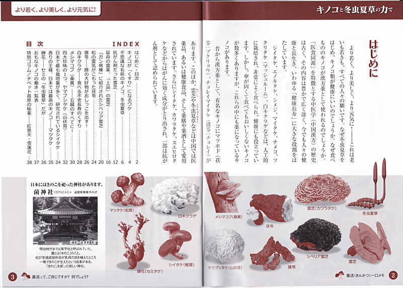 | はじめに より若く、より美しく、より元気に ----- これは老いも若きも、すべての人々の願いです。なぜ冬虫夏草を はじめ、キノコ類が健康にいいのでしょうか。なぜ食べもののキノコが漢方薬として使われるのでしょうか。 「医食同源」を特徴とする中医学(中国漢方)の歴史は古く、その内容は豊かで広く深く、今でも人々の健 康と長生き、いわゆる「健康長寿」に大きな役割をはたしています。 シイタケ、エノキタケ、シメジ、マイタケ、ナメコ、ツクリタケ(マッシュルーム)、白キクラゲなどは、人工的 に栽培され、非常によく食べられ、健康にも役立っています。しかし、傘が固くて食べてもおいしくないキノコ が数多くありますが、これらの中にも薬になっているキノコがあります。 昔から漢方薬として、有名なキノコにマツホド(茯苓:ブクリョウ)チョレイマイタケ(猪苓:チョレイ)が あります。このほか、霊芝や冬虫夏草などは中国では医薬品、あるいは健康食品、そして薬膳や薬酒として愛用 されています。さらにシイタケ、カワラタケ、スエヒロタケなどからはがんに効く成分がとり出され、一部は抗が ん剤として認められています。 |