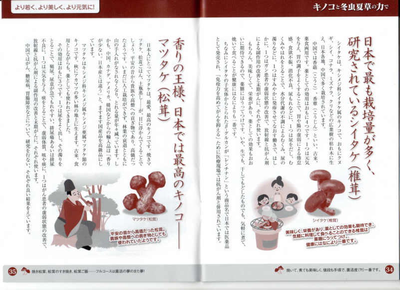 | 日本で最も栽倍量が多く、研究されているシイタケ(椎茸) シイタケは、キシメジ科シイタケ属のキノコで、おもにクヌギ、シイ、コナラ、ミズナラ、クリなどの広葉樹の枯れ木に生 え、日本各地、中国で多く栽培されています。 中国では香磨iこうこ)、香蕈(こうじん)といい、古来、薬食両用です。 薬としての効用はおもに4つです。 1つは元気を与え、胃の調子をよくすることで、胃や腸の虚弱による倦怠感、食欲不振、消化不良、尿もれなどに、 1つは尿をだし、むくみやはれをとることで、水分代謝の不調によるむくみ、尿の濁りなどに、 1つはすみやかに発疹させてなおす働きで、はしかに、1つはガン患者の虚弱状態の改善で、放射線と抗がん剤 による副作用の改善と末期がんに、それぞれ使います。 もちろん、美味しくて、栄養があり、薬としての効果もおおいに期待できるので、薬膳にはうってつけです。 いや、生でも、干してもどしたものでも、気軽に煮て、焼いて食べることが健康にはなによりも一番です。 ちなみにシイタケの子実体からとられたβ−グルカンが「レンチナン」という商品名で日本では医薬品 として発売され、「免疫力を高めてがんを抑える」ために医療現場では抗がん剤と併用されています。 香りの王様、日本では最高のキノコ マツタケ(松茸) 目本人にとってマツタケは、最愛、最高のキノコです。焼きマツタケ、松茸ごはん、土瓶蒸し……が、目に浮かんで くることでしょう。平安の昔がら貴族や高僧への貢ぎ物であり、高価だったようです。いまだに人工栽培ができず、 林業の衰退とともに山の手入れがなされなくなり、とれる量が年々減っています。 しかも、中国、カナダ、アメリカ、韓国などがらの輸入品は「香りが少ない。日本産とは違う」と、ますます国産品を 高級品にしています。 マツタケはキシメジ科キシメジ属キシメジ亜属マツタケ節のキノコです。秋にアカマツの多い林の地上に生えます。 古来、食用としながらも、薬としても使われてきました。 その効用はおもに3つです。 1つは尿をよく出し、その濁りをとることで、頻尿、尿意が急でもれやすい、排尿痛あるいは排尿不良に、 1つは元気を与え、痰をとることで、虚弱体質、咳や痰に、 1つはがん患者の虚弱状態の改善で、放射線と抗がん剤による副作用の改善と末期がんに、それぞれ使います。 中国ではがん、糖尿病、胃腸障害などについて、研究を行ない、それぞれ良い結果をえています。 |