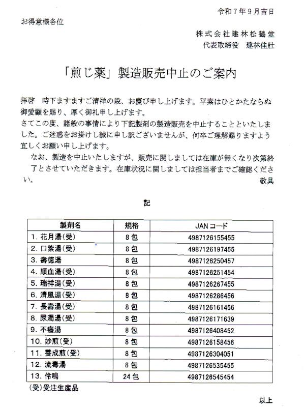 緊急のお知らせ 最後の砦というべき、 建林松鶴堂様の煎薬がすべて 製造をやめられます、 原料確保困難、また使用、医師、薬局の逓減で 存続が困難になったからです ![]() 株式会社建林松鶴堂 代表取締役 建林佳壯 「煎じ薬」 製造販売中止のご案内 拝啓 時下ますますご清祥の段、 お慶び申し上げます。平素はひとかたならぬ 御愛顧を賜り、厚く御礼申し上げます。 さてこの度、諸般の事情により下記製剤の製造販売を中止することといたしま した。 ご迷惑をお掛けし誠に申し訳ございませんが、 何卒ご理解賜りますよう 宜しくお願い申し上げます。 なお、製造を中止いたしますが、販売に関しましては在庫が無くなり次第終 了とさせていただきます。 在庫状況に関しましては担当者までご確認ください。 敬具 ―−−−−−−−−−−−−−−−−−−−−−−−−−−−−−−―――――――― 煎じ薬とは、漢方で用いられる生薬を水から煮出して有効成分を全て抽出する 飲み薬のことです。 生薬本来の薬効を最大限に引き出すとともに匂いや味も感じることができ、水分ですので、 すばやく吸収することができます。 織田信長や豊臣秀吉、徳川家康、高僧、天皇家も飲んでいた薬です。 皇家の方々の治療にも使われてきましたが、一般の方はご存じなく、使われなく なってきました。 日本の漢方薬を残すため、50年前から働きかけてきました。 戦後すぐから建林松鶴堂様が多くの煎じ薬を製造してきました。 その薬効が素晴らしく、アメリカのGHQも朝鮮戦争で多く使用しました。 GHQや厚生関係、民間の協力で守られてきた薬です。 日本のみならず中国での評価も高く、中国のプロがあこがれる状態でした。 この様に日本の誇りの薬だったのです。 しかし、これらの薬を使いこなすことができず、うまく使えば後世にまで残せたものを、 この様に無くしてしまうのは残念でなりません。 もっと建林松鶴堂様の薬を知っていただいて、使ってほしいのです。 今残っている薬を使いこなし、守ってほしいのです。 官民挙げて素晴らしい日本の宝、伝統薬を使って、守り、残して頂きたいのです。 建林松鶴堂様は煎じ薬の製造を中止されましたが、他に多くの漢方薬を販売されています。 また、小太郎漢方製薬様とは協力し多くの漢方薬を販売されています。 ウチダ和漢薬様の漢方の丸薬は優れたものが多くあります。 救心製薬様では、価格の高騰と供給不足から製造が中止された牛黄の代わりに、牛黄を配合した 救心感應丸 氣 が製造され、飲みやすくなり、新しい形で牛黄を残されたことは幸せです。 また、貴重な”キノコ”の冬虫夏草も価格の高騰や、供給の不足から備蓄が始まっています。 薬は使われ無くなれば消えていきます。守らなければ、使わなければ無くなります。 是非、当店にお越しください、薬の最新情報や、在庫もお知らせいたします。 お待ちしています 製造が中止される煎じ薬の一例 ![]() ![]() ![]() ![]() 片桐棲龍堂に遺されている薬の一例 ![]() ![]() ![]() 製造が中止された薬 ![]() ![]() ![]() ![]() これらのくすりはもう有りません 今ある薬が無くなる前にお越しください。 |
