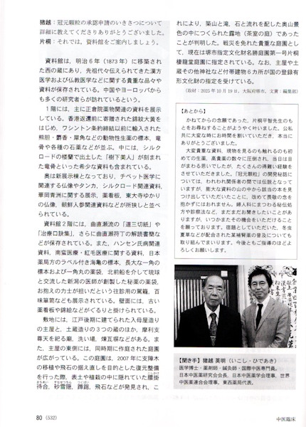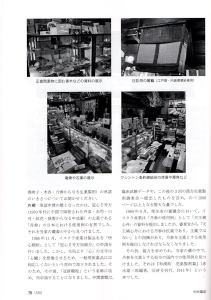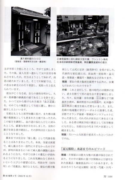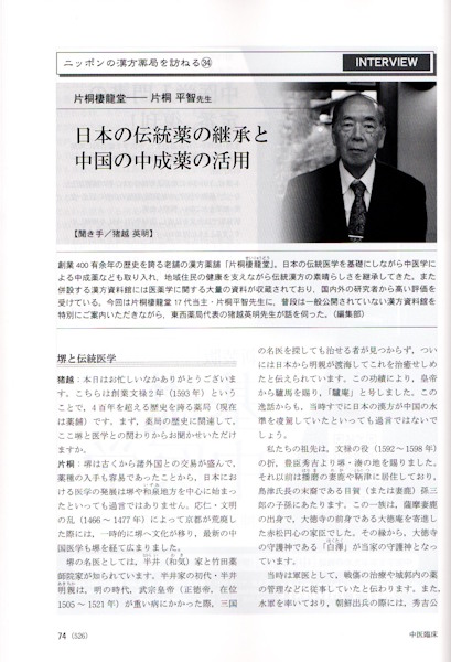 近年日本を代表する漢方の専門雑誌に当家のこと度々取り上げていただき有り難い事と思っています。 冠元顆粒の関連で専門学術医薬雑誌の「中医臨床」で特集していただきました。 本雑誌は中国医学関連の最高権威の医療関係者専門雑誌で漢方圏の中国,韓国,台湾,英国, フランスなど 専門家必携の 最新中医薬雑誌で齢をかさねて来宅起稿された編集部, 同伴のイスクラ陳社長, 中医薬研究会会長猪越様に感謝いたします ![]() ニッポンの漢方薬局を訪ねる 片桐棲龍堂 片桐 平智先生 日本の伝統薬の継承と中国の中成薬の活用 ![]() Profile 片桐平智 (かたぎりよしとも) 1947年生まれ。 大阪薬科大学卒。 大阪府衛生部 (現・健康医療部) を経て, 創業4百有余年以上の 片桐棲龍堂を大阪府堺市で経営。 日本の伝統薬の継承と黎明期の中成薬の開発導入に貢献する。 奈良東大寺修二会の薬物担当。 日本東洋医学会会員。 日本初の漢方資料館を開設運営し、 欧州や中国など海外の専門家との国際交流を続ける。 【聞き手/猪越英明】 創業400有余年の歴史を誇る老舗の漢方薬舗 「片桐棲龍堂」。 日本の伝統医学を基礎にしながら中医学による中成薬なども取り入れ、地域住民の健康を支えながら 伝統漢方の素晴らしさを継承してきた。 また併設する漢方資料館には医薬学に関する大量の資料が収蔵されており, 国内外の研究者から 高い評価を受けている。 今回は片桐棲龍堂17代当主・片桐平智先生に, 普段は一般公開されていない漢方資料館を 特別にご案内いただきながら、東西薬局代表の猪越英明先生が話を伺った。 (編集部) 堺と伝統医学 猪越: 本日はお忙しいなかありがとうございます。 こちらは創業文禄2年(1593年) ということで, 4百年を超える歴史を誇る薬局 (現在は薬舗) です。 まず, 薬局の歴史に関連して,ここ堺と医学との関わりからお聞かせいただけますか。 片桐: 堺は古くから諸外国との交易が盛んで薬種の入手も容易であったことから,日本における医学の 発展は堺や和泉地方を中心に始まったといっても過言ではありません。 応仁・文明の乱(1466〜1477年) によって京都が荒廃した際には,一時的に堺へ文化が移り, 最新の中国医学も堺を経て広まりました。 堺の名医としては, 半井 (和気わき) 家と竹田薬師院家が知られています。 半井(なからい)家の初代 半井明親(あきちか)は,明の時代、武宗皇帝 (正徳帝,在位1505〜1521年) が 重い病にかかった際, 三国の名医を探しても治せる者が見つからず、ついには日本から明親が渡海して これを治癒せしめたと伝えられています。 この功績により, 皇帝から驢馬を賜り, 「驢庵」 と号しました。 この逸話からも、当時すでに日本の漢方が中国の水準を凌駕していたといっても過言ではないでしょう。 私たちの祖先は,文禄の役 (1592〜1598年)の折, 豊臣秀吉より堺 湊の地を賜りました。 それ以前は播磨(はりま)の妻鹿(めが)や鞆津(とものつ)に居住しており,島津氏長の末裔である 目賀 (または妻鹿) 孫三郎の子孫にあたります。 この一族は, 薩摩妻鹿の出身で, 大徳寺の前身である大徳庵を寄進した赤松円心の家臣でした。 その縁から, 大徳寺の守護神である 「白澤 (はくたく)」 が当家の守護神となっています。 当時は軍医として, 戦傷の治療や城郭内の薬の管理などに従事していたと伝わります。 また,水軍を率いており, 朝鮮出兵の際には, 秀吉公より「櫓の音が見事に揃っている」と称賛され, 「音揃(おんぞろ)」 の姓を賜ったといわれています。 その折, 大坂川口の堺湊浦に土地を授けられました。 以後, 堺・湊に居を構えてからは, 「戦傷も腹部の傷も同じ」という考えのもと, 産婦人科を専門とし、 明治に至るまで諸藩の御典医なども務めました。 ![]() 片桐家の系譜 猪越: 薩摩の島津家と関係のある家系だったのですね。 片桐: 系図によれば, 当家の祖先は鎌倉時代(12世紀末〜1333年) にその端を発し, 清和源氏の流れを汲む薩摩の島津氏長の末裔で、目賀氏を称していました。 古い定紋は島津家と同様に 「丸に十の字」 と 「笹龍胆(ささりんどう)」 の紋様です (現在の家紋は音揃家の軍扇にちなみ高崎扇)。 建武の中興 (1334〜1336年)の際, 播州・苔縄(こけなわ)城主の赤松円心が功を立てた折, これに従軍した目賀孫三郎が, 当家における医学の祖と伝えられています。 孫三郎は優れた兵術家 剣術家で,また四書五経にも通じており, 軍陣医学, すなわち金創医学の実践にも卓越していたと伝承されています。 以来, 当家には軍師としての系統が受け継がれ, 医学の知識も口訣(<けつ)として 代々伝えられてきました。 また自家の存続のために蓄えられた医学の知識には, 南蛮系の薬物も含まれていました。 大名との親交も深く, 当時を伝える遺品として,桂皮油や椰子油を入れたルソンの薬壺や, オランダ製のギャマン薬徳利などが今も伝わっています (内藤くすり博物館に寄託)。 その間, 茶道の数寄者であった斗々屋を継ぐために, 音揃伊左衛門の子 治兵衛を養子とし て出すなど, 堺の豪商た